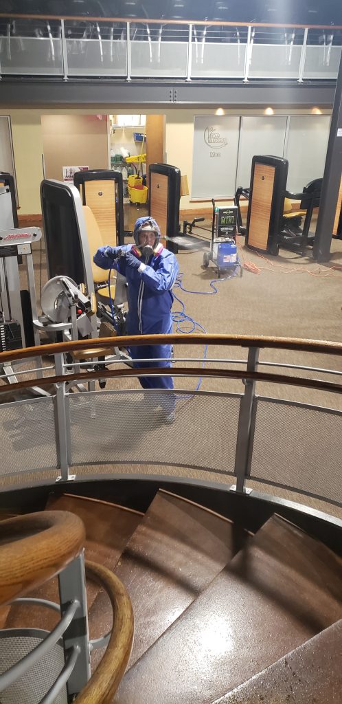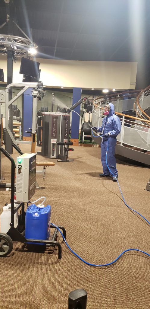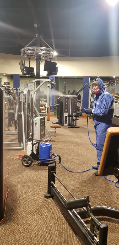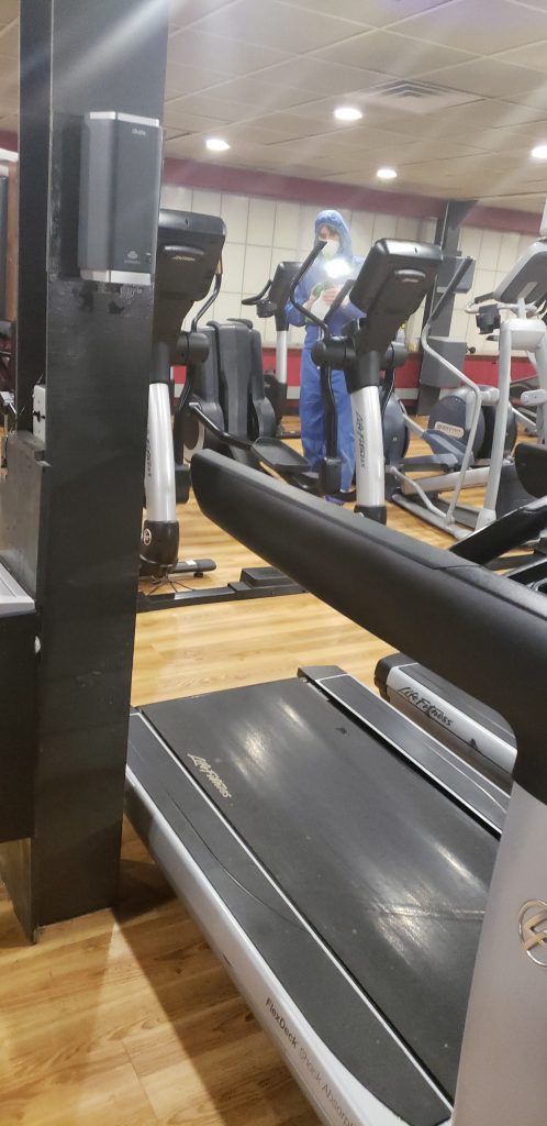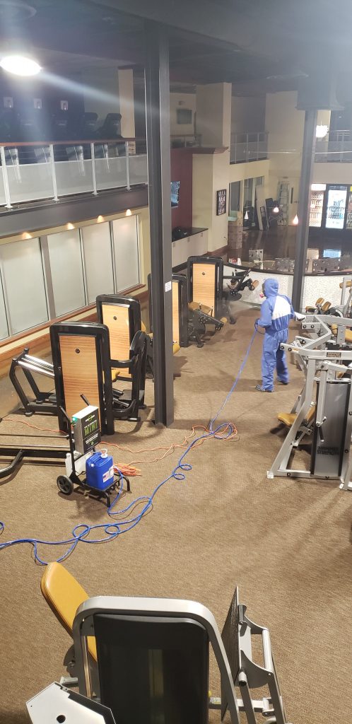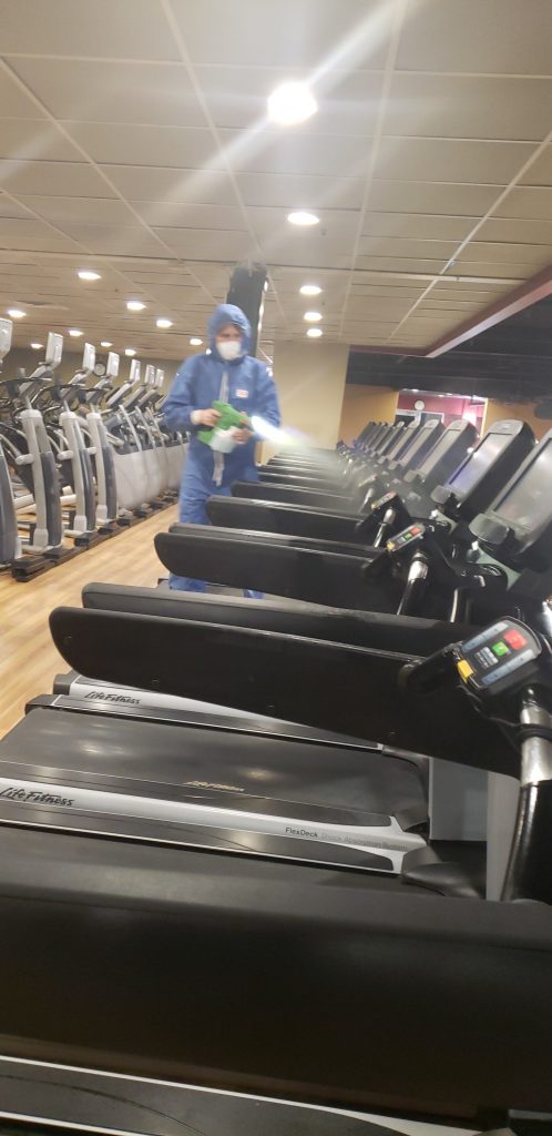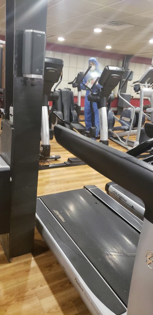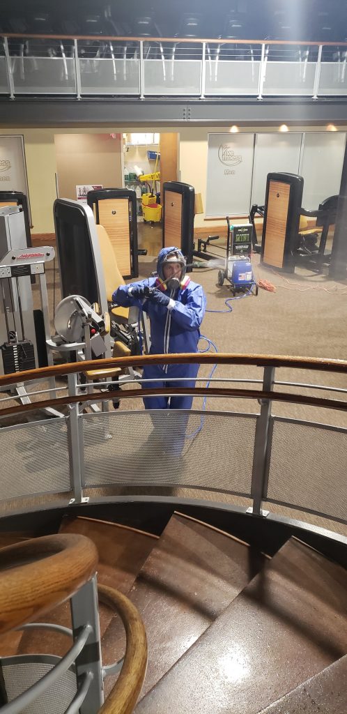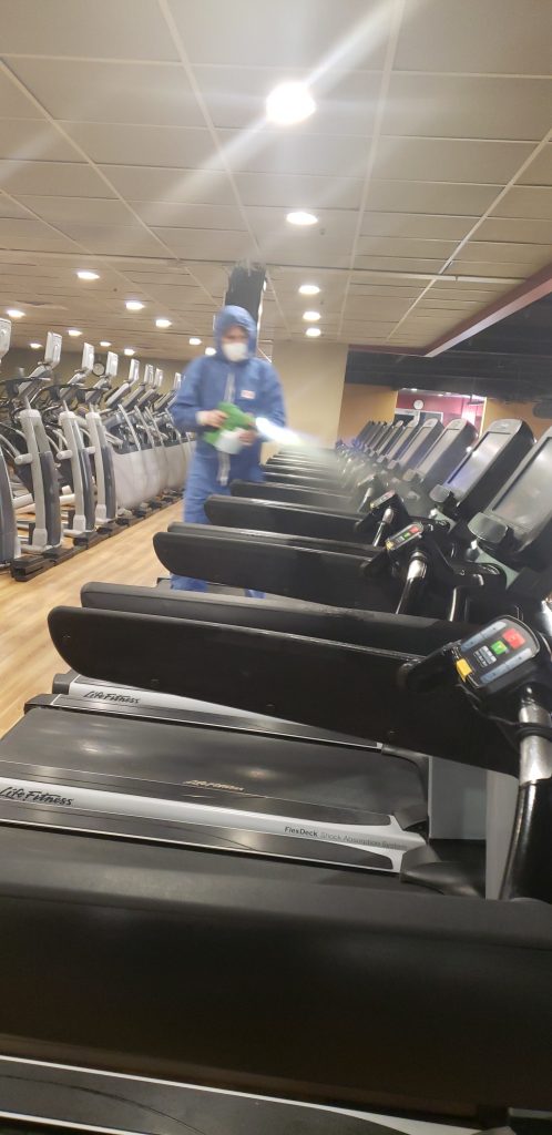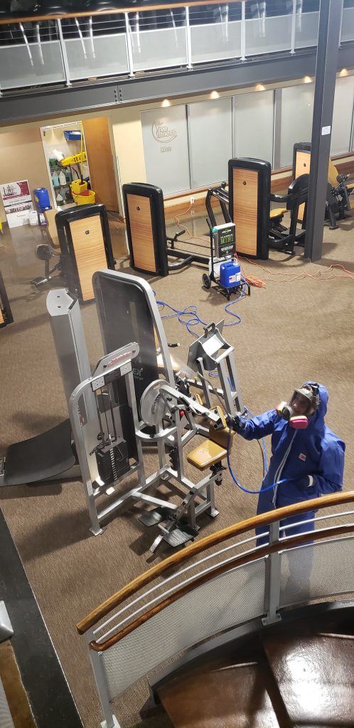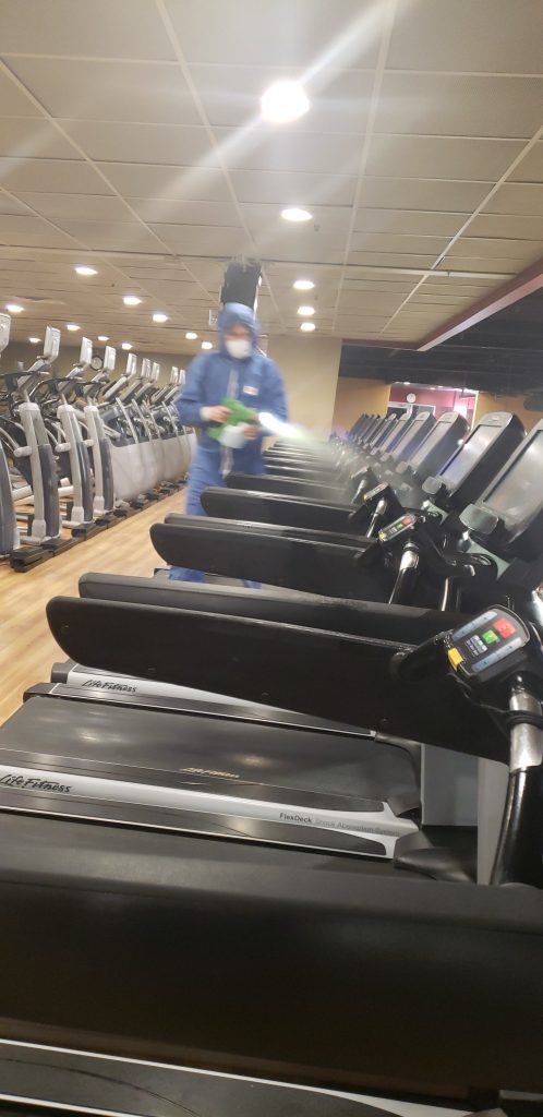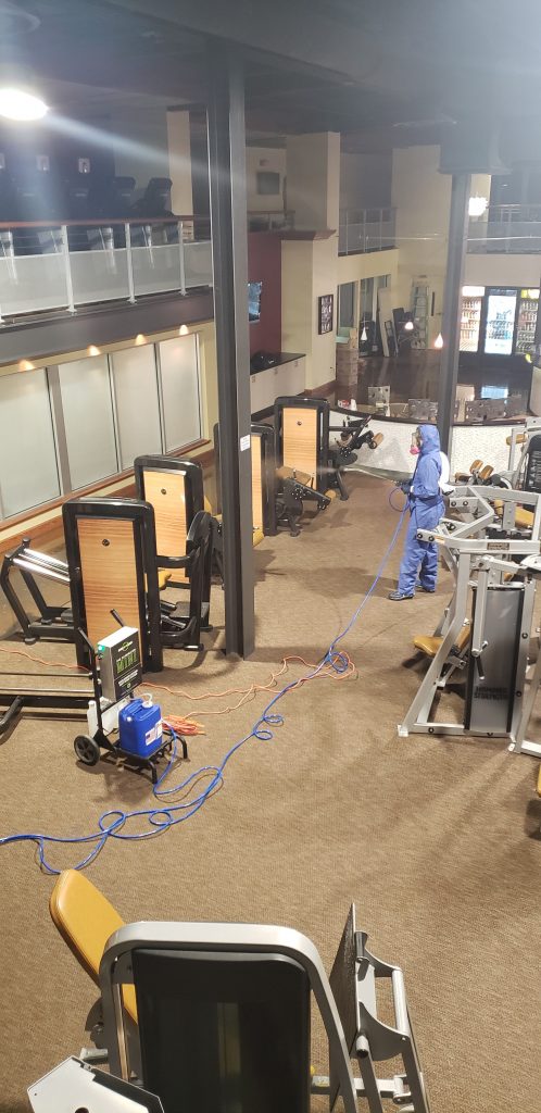 Shore Remediation in combination with its sister commercial cleaning Company Emerald Cleaning determined a bio remediation protocol and scope of work tailored for the fitness facility during the period of time in March whilst it remained open and additionally prior to reopening upon which we coated the facility with antimicrobial sealant Bioshield